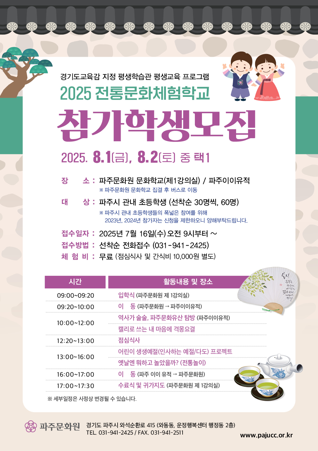 무더운 여름 방학에 친구들과 즐거운 추억을 만들 '2025 전통문화체험학교' 참가학생을 아래와 같이 모집합니다.