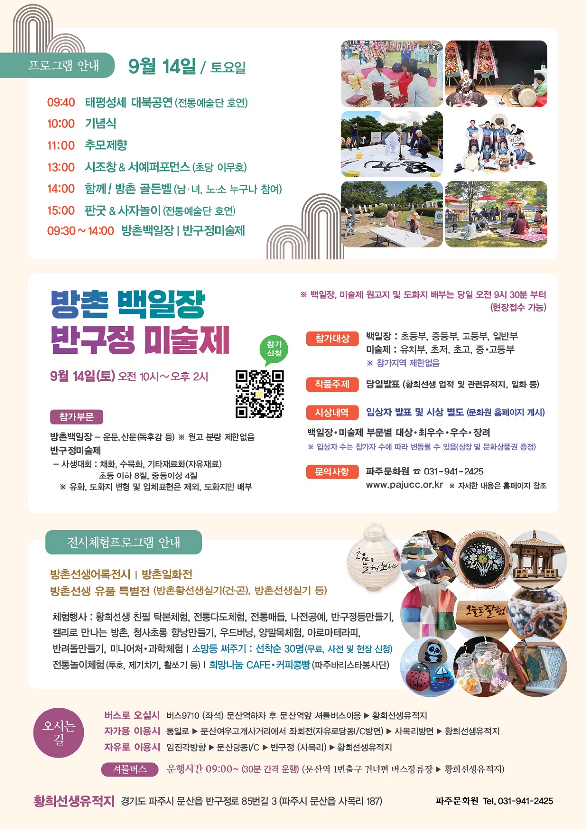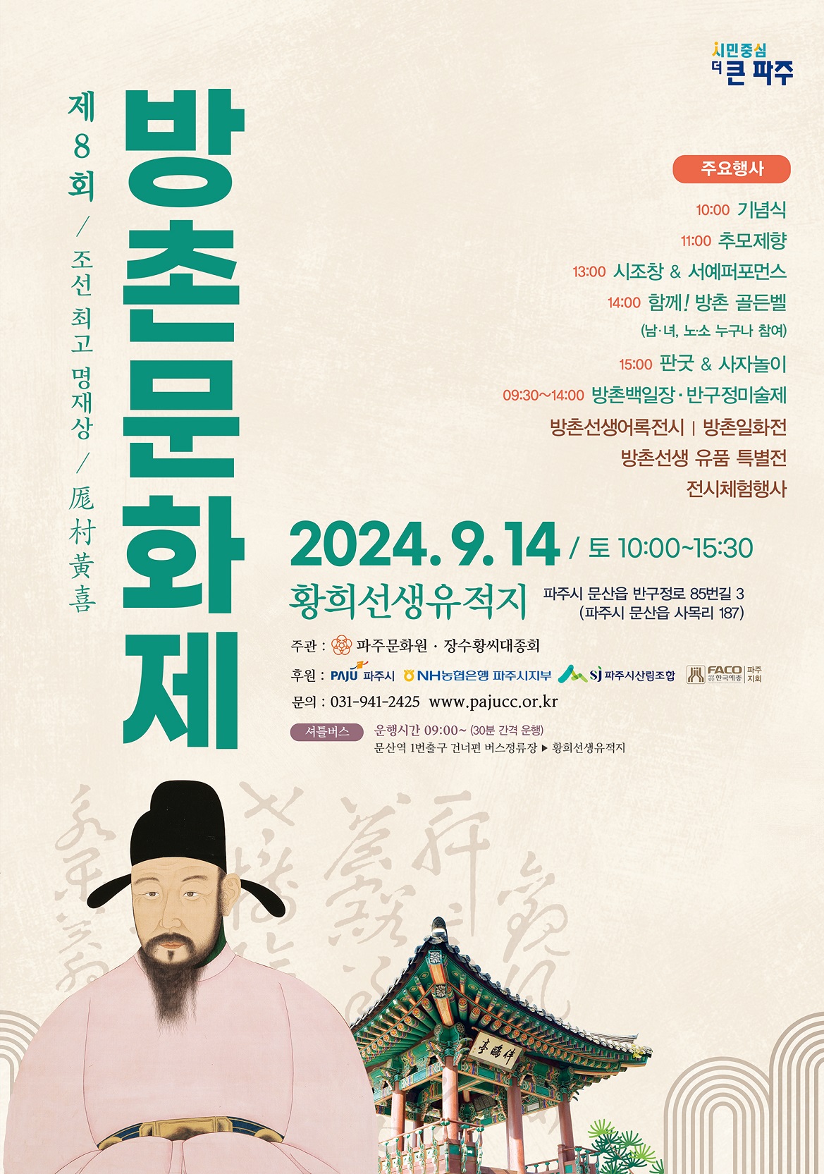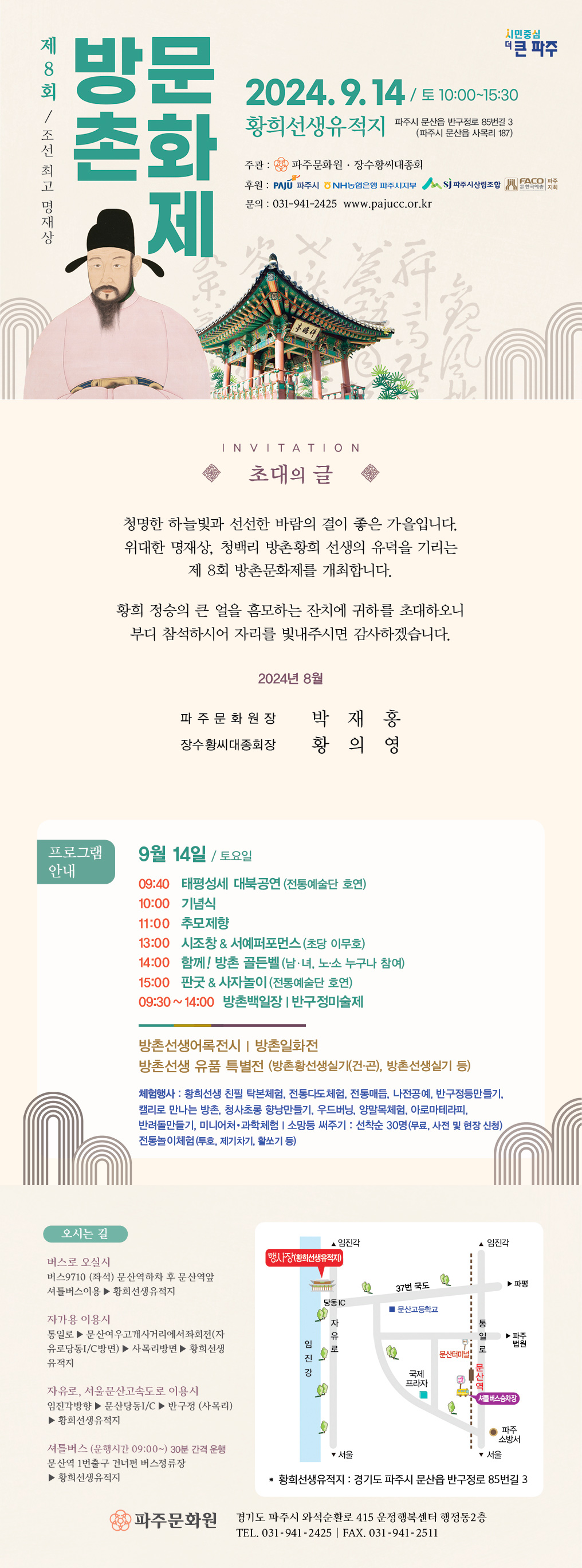 제 8회 방촌문화제 개최 안내 오는 9월 14일 토요일, 위대한 명재상 청백리 방촌황희 선생의 가르침을 되새기고, 이어가고자 제 8회 방촌문화제가 황희선생유적지에서 개최됩니다. 황희 정승의 큰 얼을 기리는 잔치마당에 귀하를 초대하오니 가족과 함께 오셔서 즐거운 시간 보내다 가세요^^