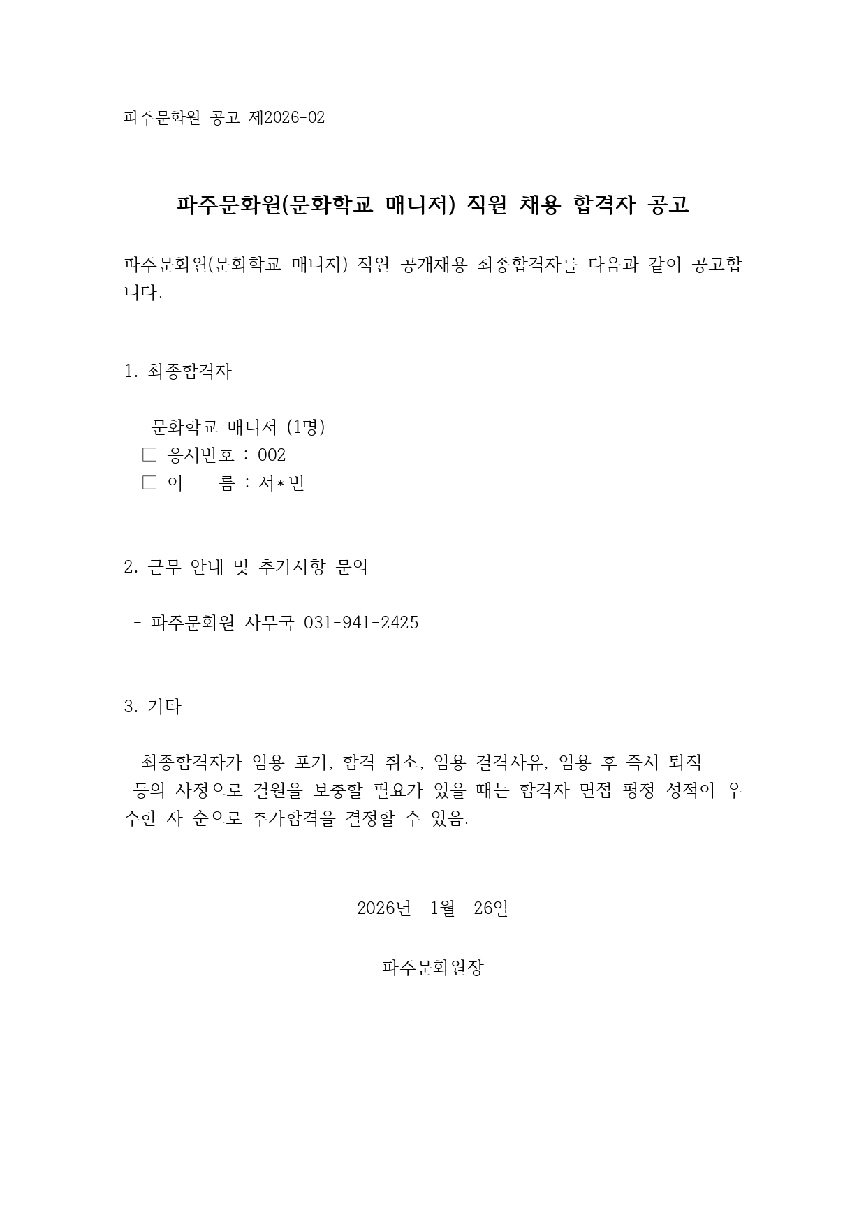| [공지] 파주문화원(문화학교 매니저) 직원 채용 합격자 공고 | ||